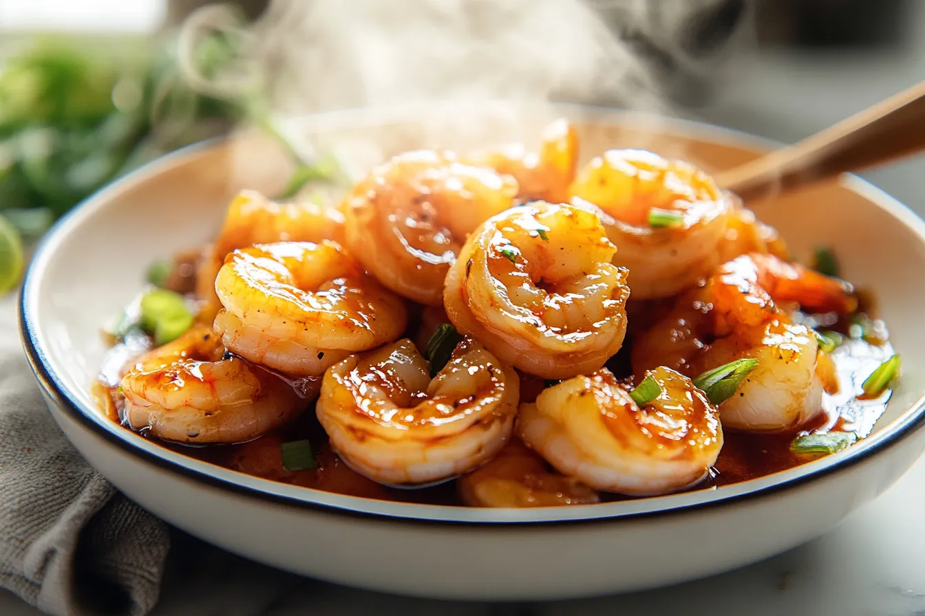 Remove the skillet from heat and transfer the shrimp to a serving dish. Garnish with chopped green onions and a sprinkle of sesame seeds for an appealing visual touch and added texture.