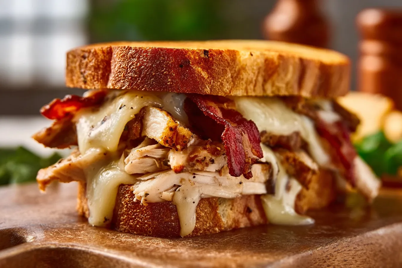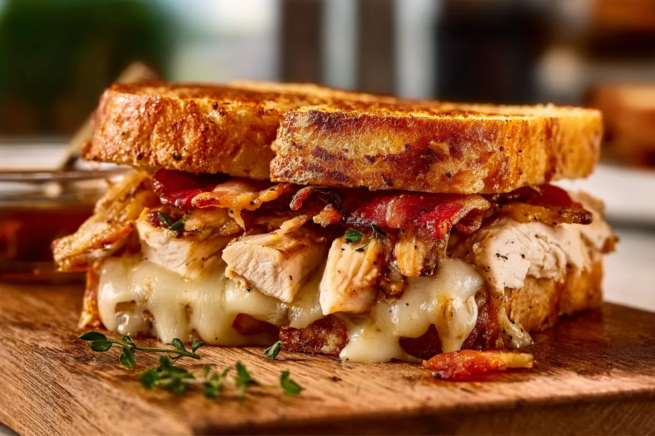 A mouthwatering BBQ chicken bacon melt sandwich that combines juicy chicken, crispy bacon, and flavorful BBQ sauce, perfect for a quick meal.