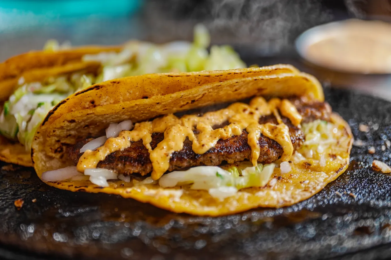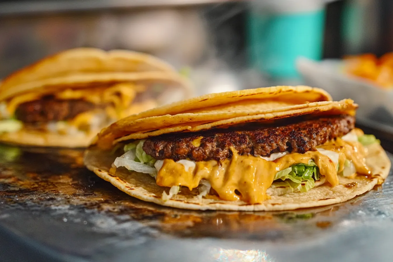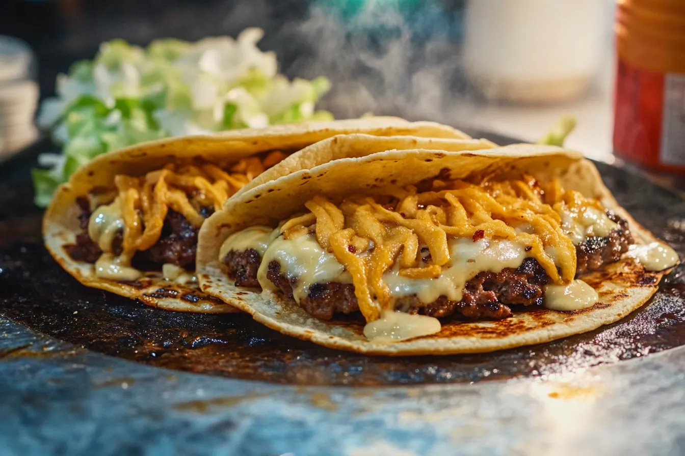 Savor irresistible cheesy smashburger tacos cooked to griddle perfection Enjoy a tasty fusion of flavors in every bite