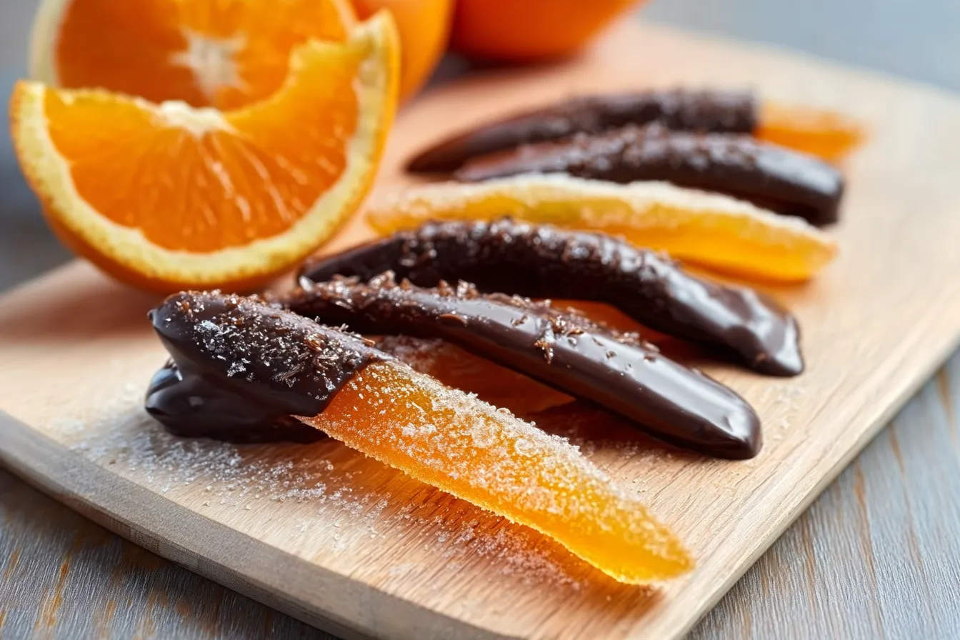Delight in these chocolate-dipped candied orange peels, a perfect treat combining zesty orange and rich chocolate in every delicious bite. (155 chars)