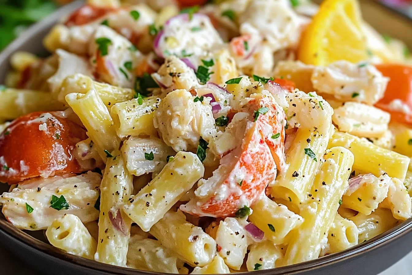 Crab Pasta Salad : What if one chilled, creamy pasta salad could steal the spotlight at your next summer gathering? Say hello to Crab Pasta Salad, a refreshing, flavor-packed dish that has quietly earned its place as a potluck legend. This isn’t just a bowl of noodles with a little dressing—this is the kind of salad that guests go back for, the one that disappears before the burgers hit the grill.