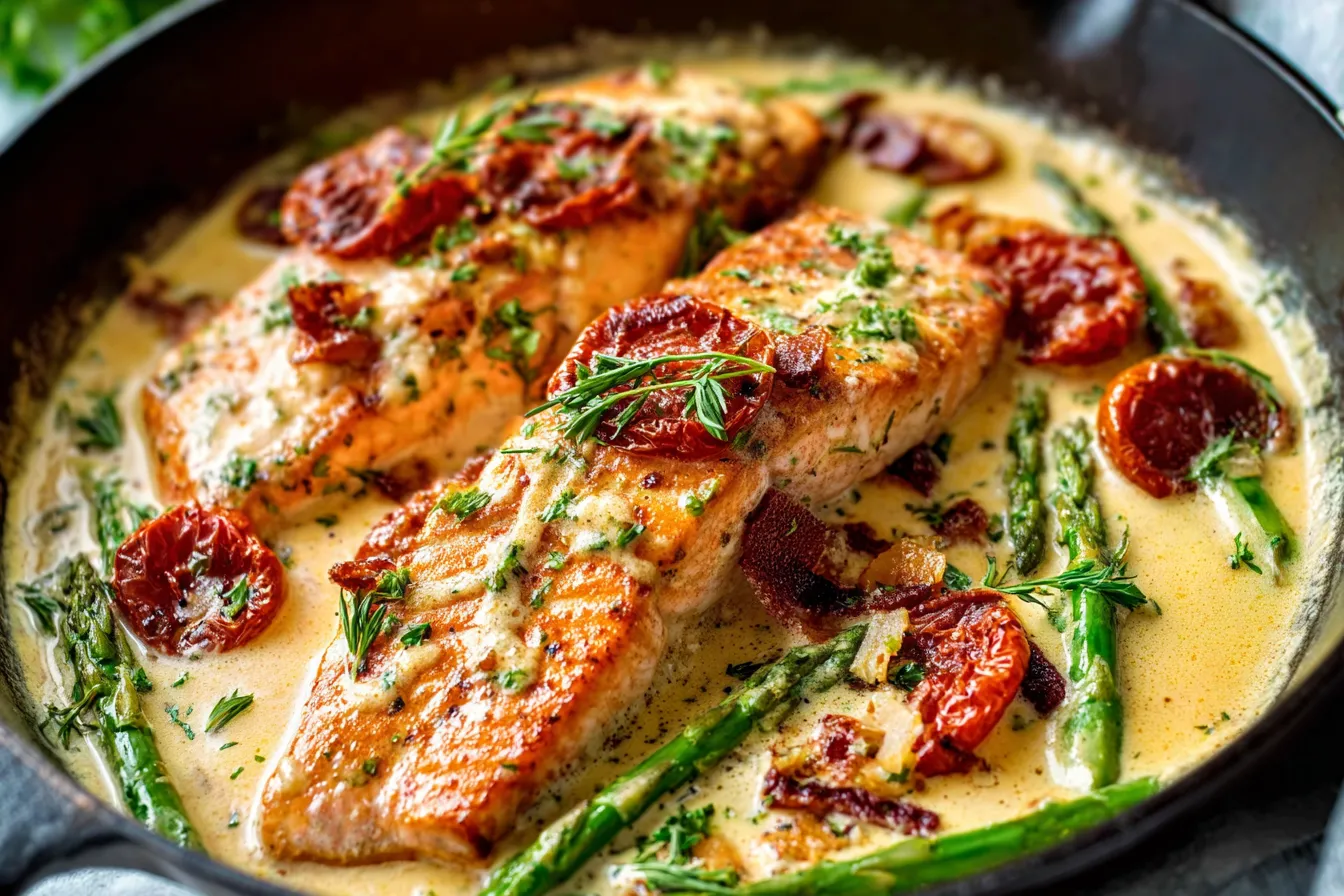 Remove the skillet from the heat and garnish with fresh basil or parsley. Serve hot, allowing the luscious sauce to elevate each bite of salmon!