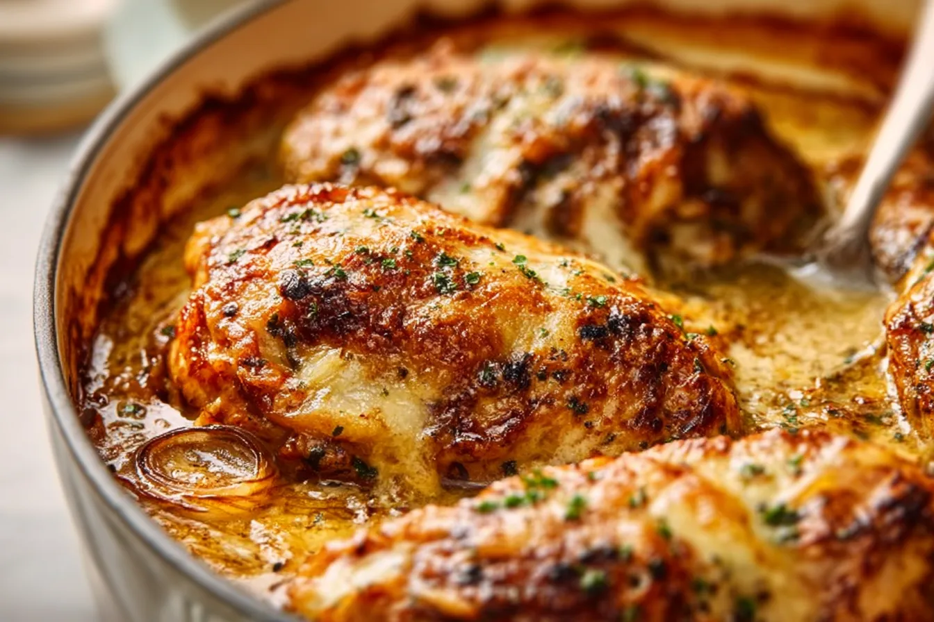 A comforting dish that combines juicy chicken breasts with caramelized onions and melted Gruyère cheese, perfect for any occasion.