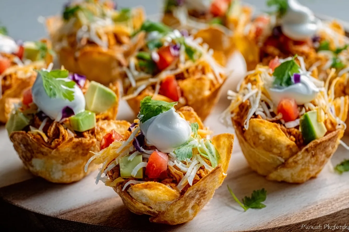 Savor Mini Chicken Taco Cups at your next gathering. Perfect party appetizer for a flavorful twist that guests will love! Enjoy the fiesta! (153 chars)