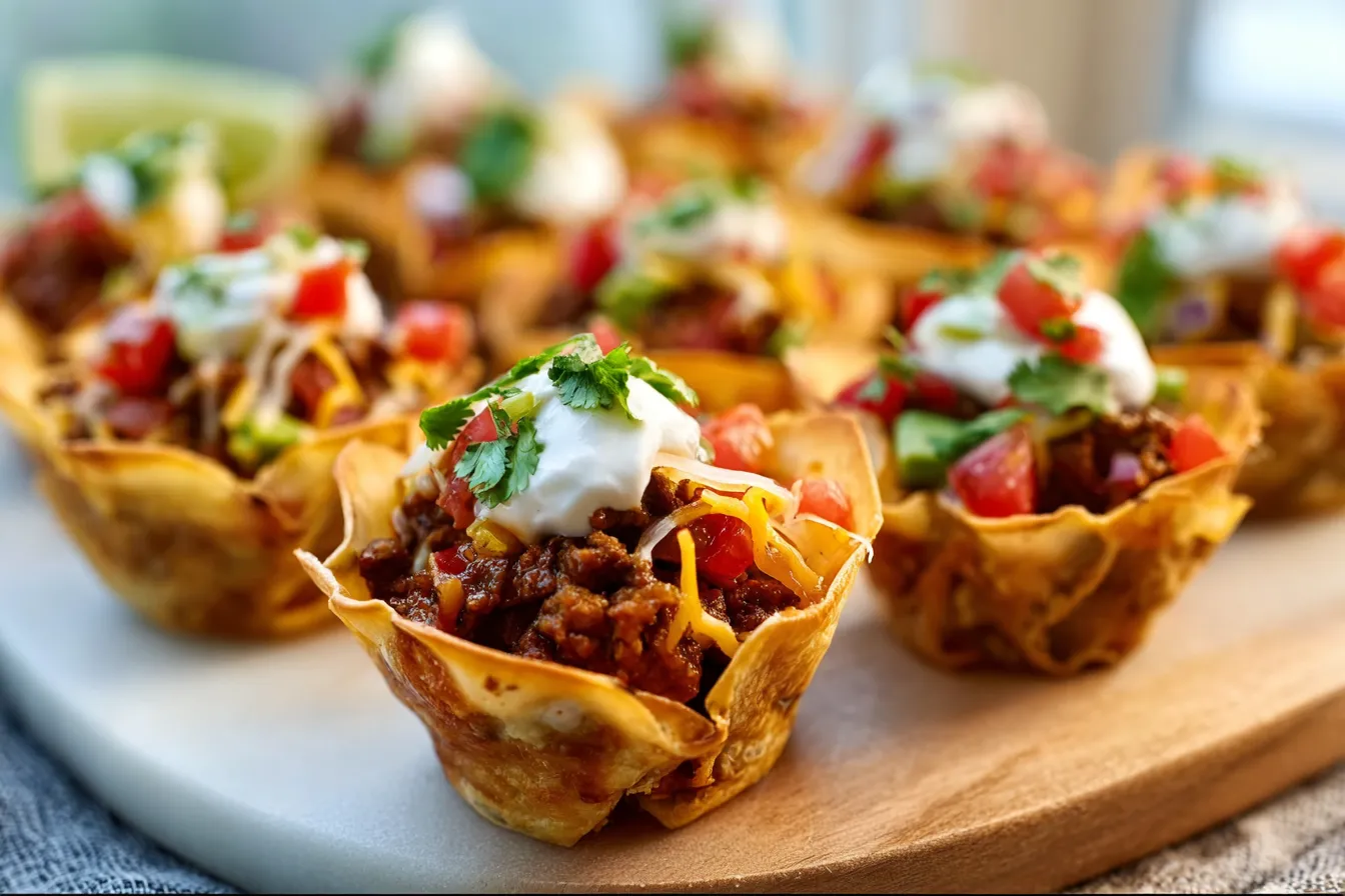Mini Taco Cups are a fun, crowd-pleasing appetizer filled with the delicious flavors of tacos in a crunchy won’t wrapper. Perfect for any gathering!